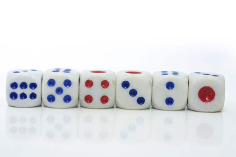 一种立体小方块造型的器具,有六个面分别刻有1到6点,其中1点和4点是红色,其余点数均为黑色,也可称之为"骰子",在每局开始前由庄家投掷,根据点数确定开牌位置。