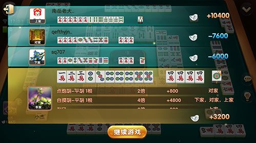 玩家胡牌后,如果此时还有麻将牌未摸完或者少于三位玩家胡牌,则游戏继续进行,已胡牌的玩家在不改变胡牌牌型的前提下可以进行杠和胡的操作,之后只能摸牌打牌不能换手牌,这样玩家先胡一个平胡可能整个游戏过程还是输分,因为别的玩家可以在之后胡大牌。